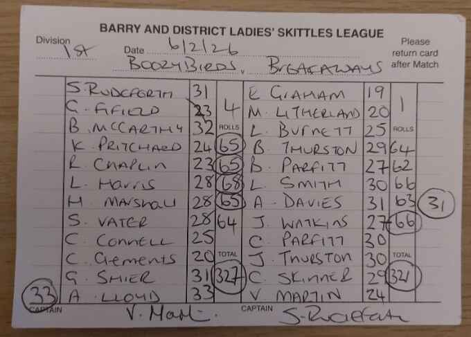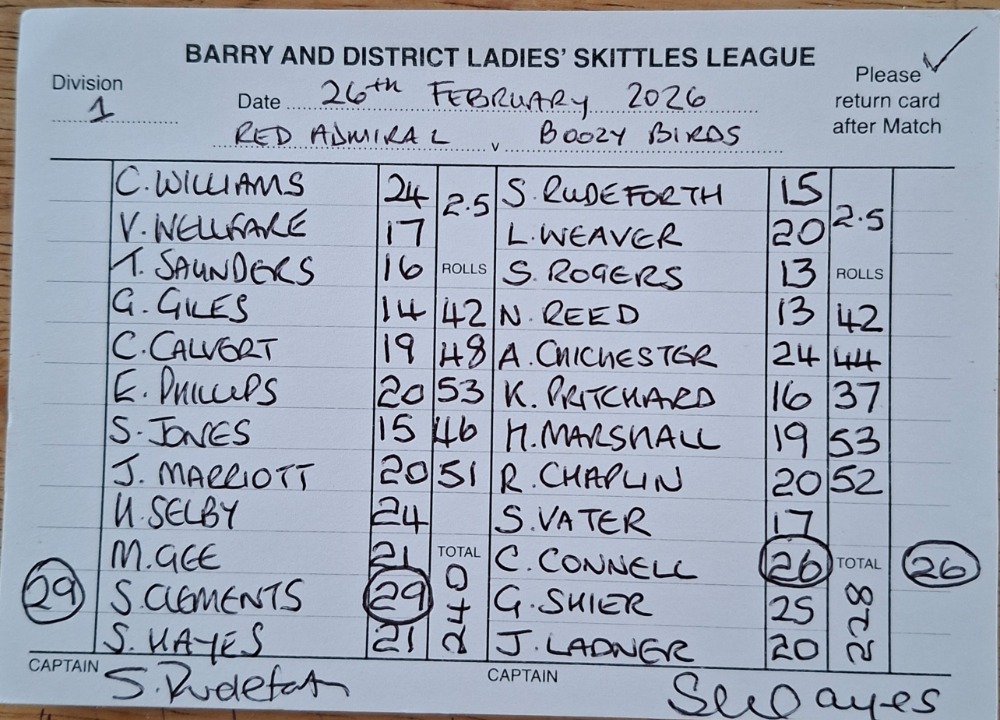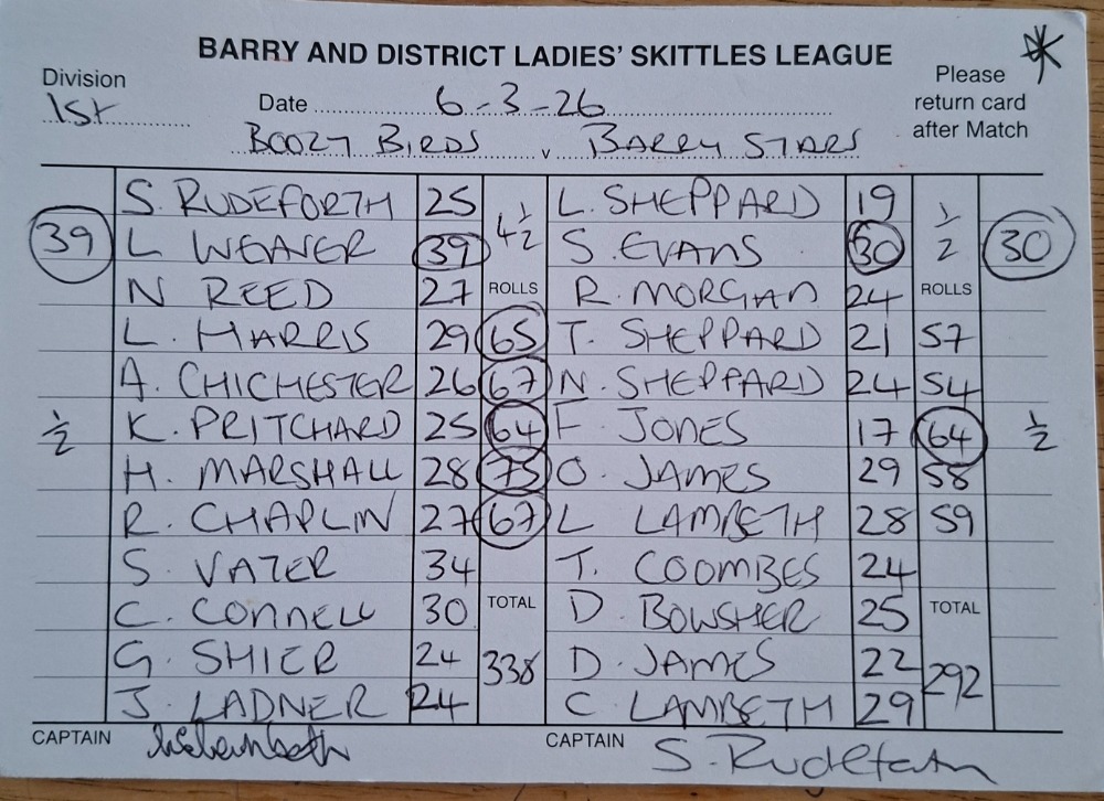 | Boozy Birds | Barry Stars | 02/03/2026 | Win League - 2 Points Rolls - 9 Points | ![]() | League Total - 9 Points Rolls Total - 80 Points |