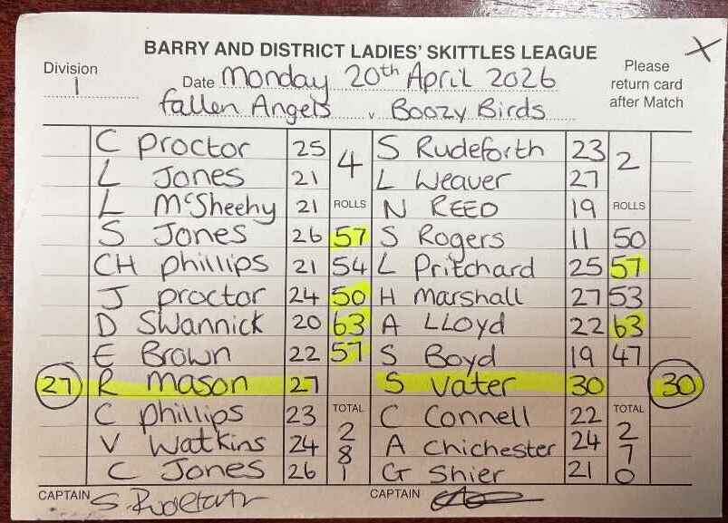 | Fallen Angels | Boozy Birds | 20/04/2026 | Loss League - 0 Points Rolls - 5 Points | ![]() | League Total - 11 Points Rolls Total - 95 Points |