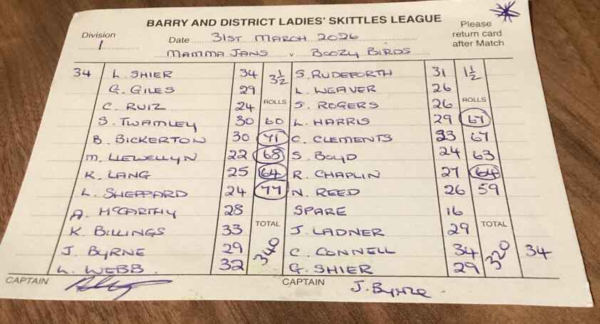 | Barry Stars | Boozy Birds | 13/10/2025 | Loss League - 0 Points Rolls - 2 Points | ![]() | League Total - 0 Points Rolls Total - 19 Points |