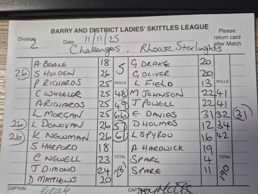 Rhoose StarlightsChallengers30/03/2026Awaiting ScoresLeague Total - 8 Points