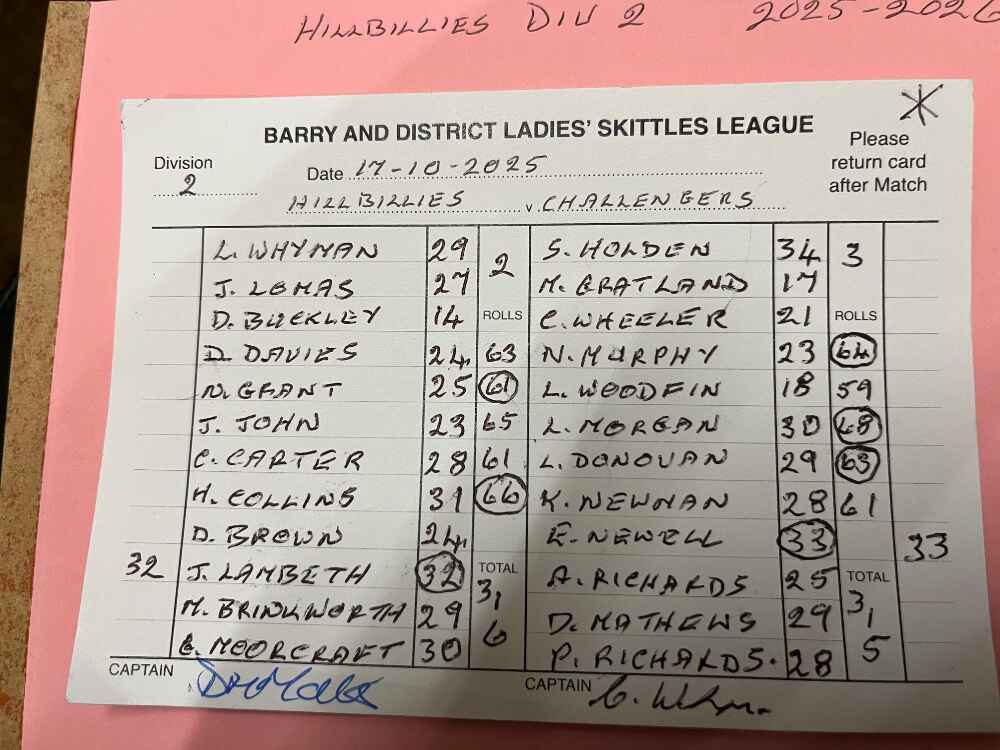 Bobbys GirlsChallengers17/11/2025Awaiting ScoresLeague Total - 8 Points