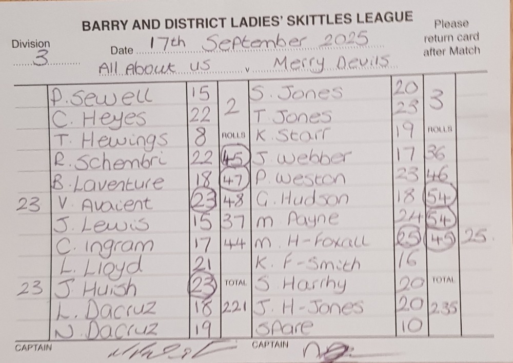 Merry DevilsBarry Island Fraggles08/12/2025Awaiting ScoresLeague Total - 2 Points
