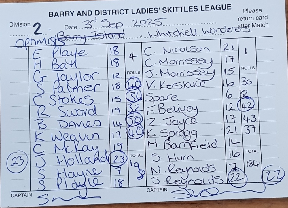 Optimists | Witchill Wanderers | 01/09/2025 | Win League - 2 Points Rolls - 8 Points | ![]() | League Total - 2 Points Rolls Total - 8 Points |