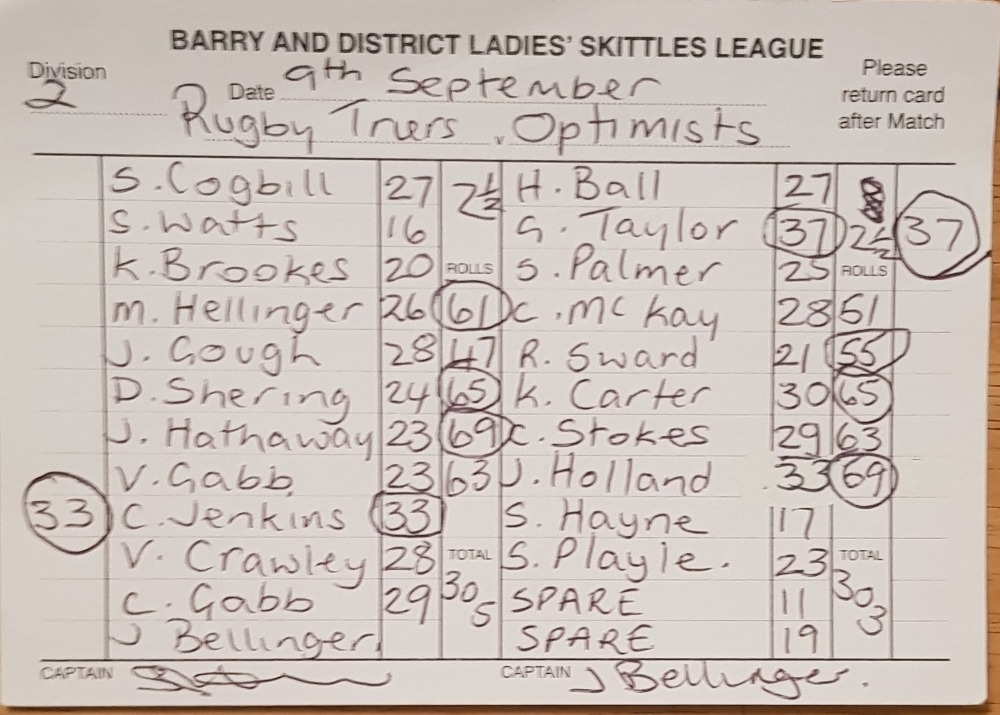 Optimists | Hillbillies | 15/09/2025 | Win League - 2 Points Rolls - 8 Points | ![]() | League Total - 4 Points Rolls Total - 21 Points |