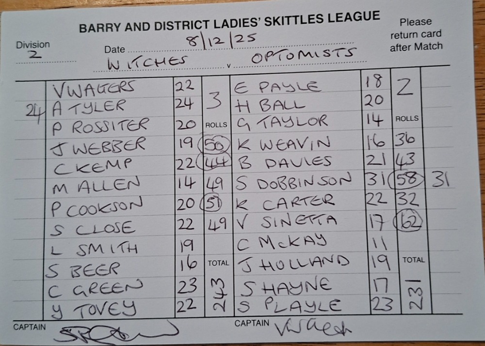 | Optimists | Witches | 27/04/2026 | Awaiting Scores | League Total - 14 Points Rolls Total - 74 Points |