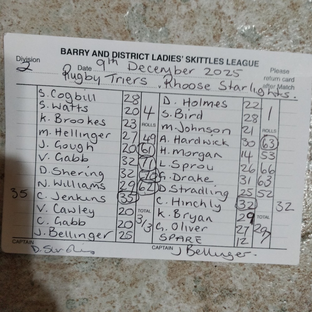 | Bobbys Girls | Rhoose Starlights | 06/10/2025 | Loss League - 0 Points Rolls - 2 Points | ![]() | League Total - 4 Points Rolls Total - 23 Points |
