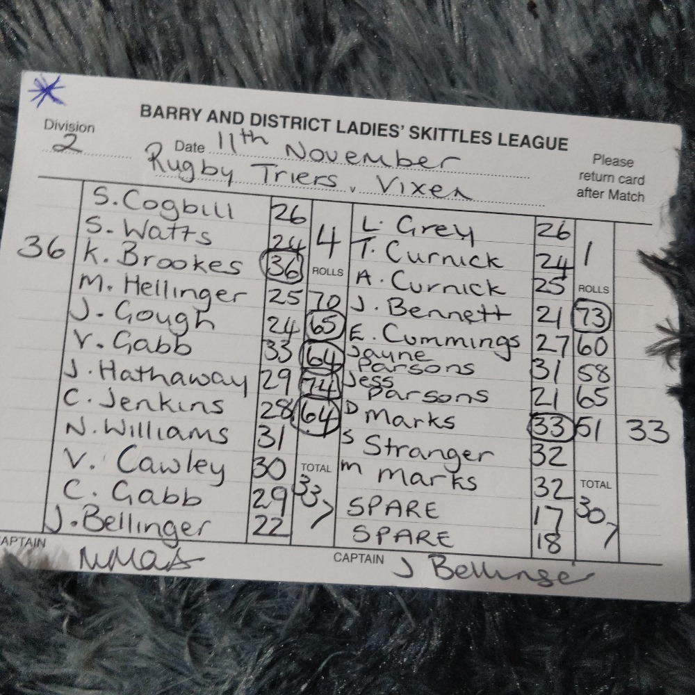 | Rugby Triers | Vixens | 10/11/2025 | Win League - 2 Points Rolls - 8 Points | ![]() | League Total - 6 Points Rolls Total - 27 Points |
