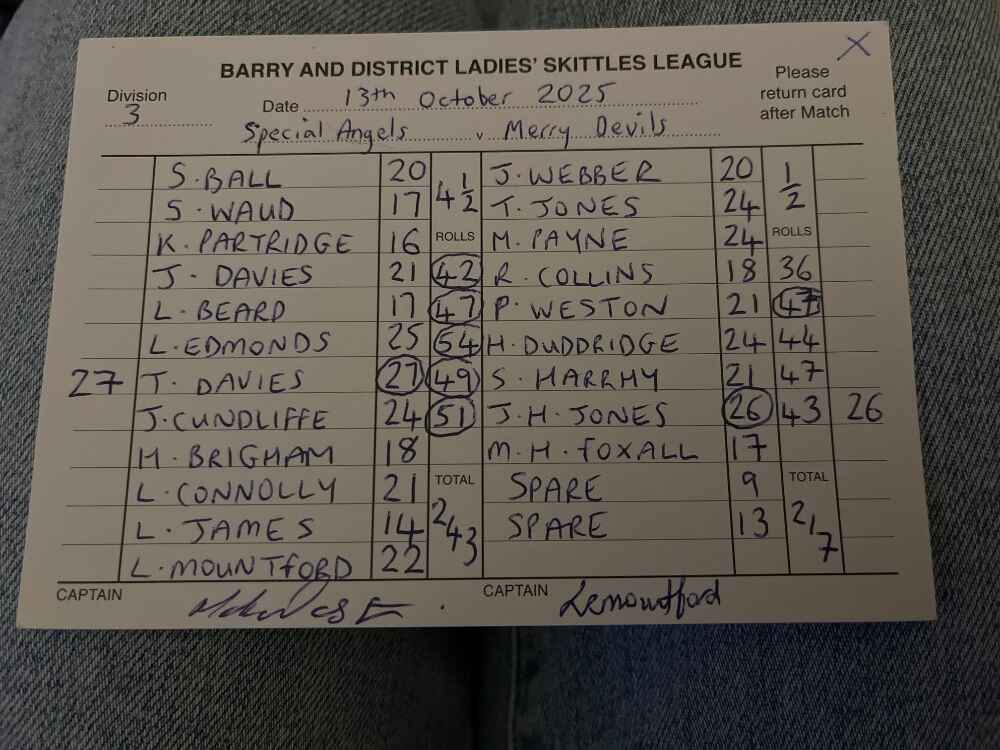| Dolly Mixtures | Special Angels | 27/04/2026 | Awaiting Scores | League Total - 14 Points Rolls Total - 55 Points |