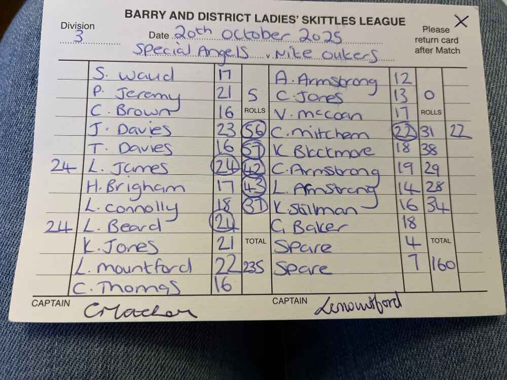 | Special Angels | Nite Outers | 20/10/2025 | Win League - 2 Points Rolls - 10 Points | ![]() | League Total - 14 Points Rolls Total - 55 Points |