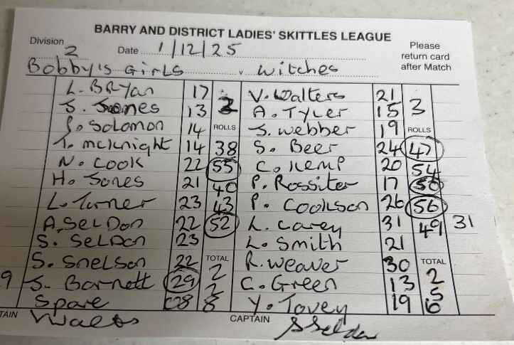 | Bobbys Girls | Witches | 01/12/2025 | Win League - 2 Points Rolls - 6 Points | ![]() | League Total - 6 Points Rolls Total - 38 Points |